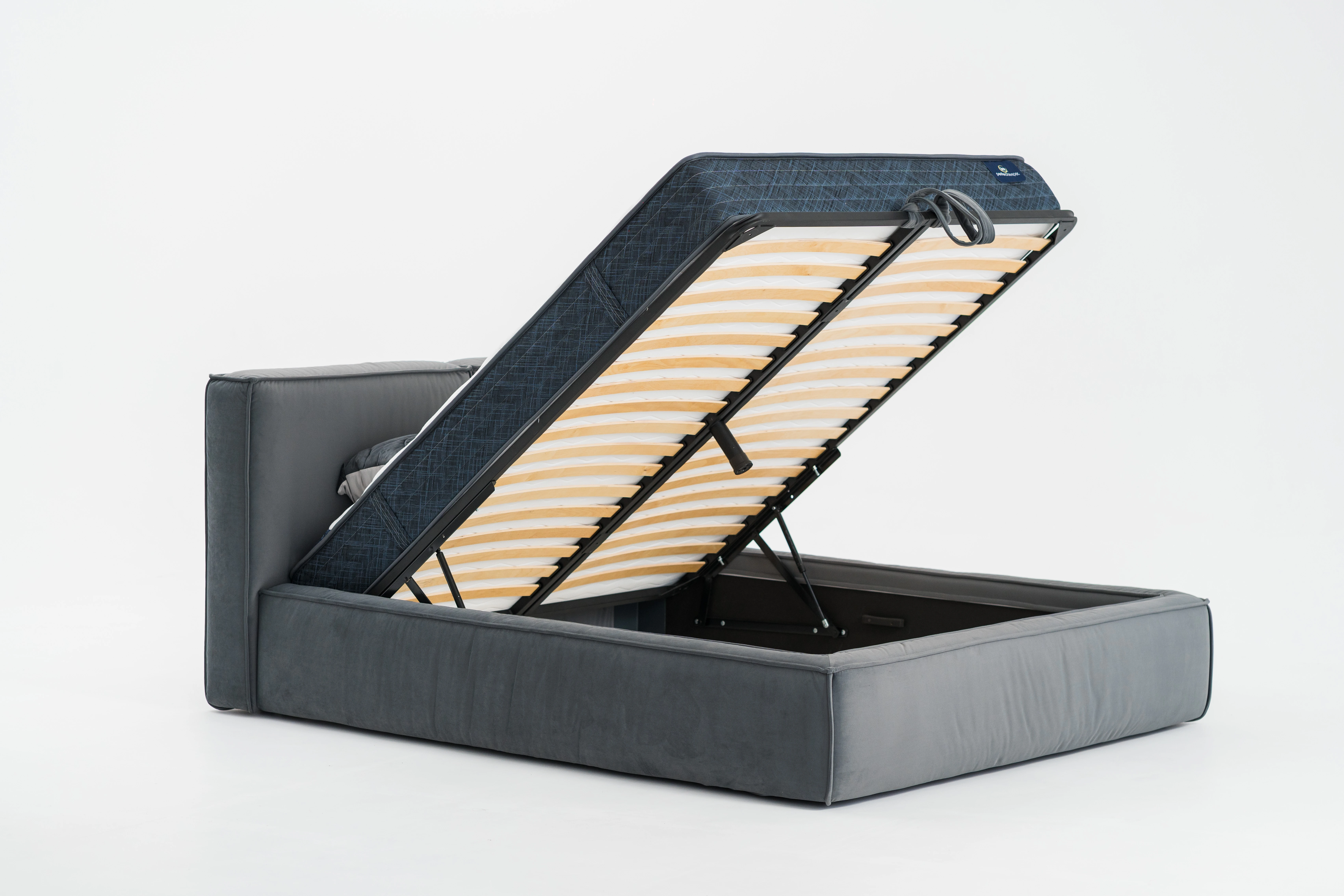 Patul supraetajat cu mecanism de ridicare reflectă cele mai bune tendințe moderne de design. O tăblie moale și voluminoasă sub formă de perne, pliuri decorative elegante și o geometrie corectă.
