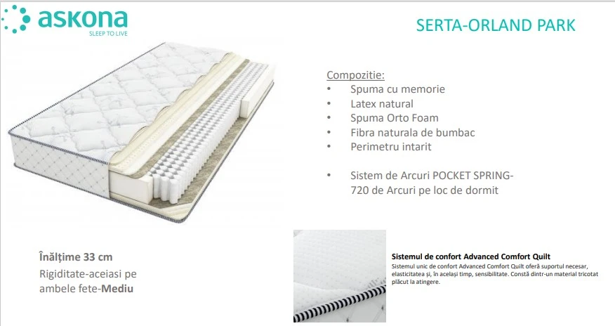 Sistemul unic de confort Advanced Comfort Quilt oferă suportul necesar, elasticitatea și, în același timp, sensibilitate. Constă dintr-un material tricotat plăcut la atingere, cu fibre de celuloză de pin cu tulpină albă, fibre hollotec antialergenice și spumă celulară Serta Oxy Comfort. Serta OxyFoam crește vizibil circulația aerului și are, de asemenea, un efect de micro-masaj. Datorită unei tehnologii unice brevetate pe ambele părți ale saltelei, se menține o temperatură confortabilă pe tot parcursul anului, indiferent de condițiile meteorologice - nu va fi cald vara și nici frig iarna. Stratul superior este igienic și foarte rezistent.